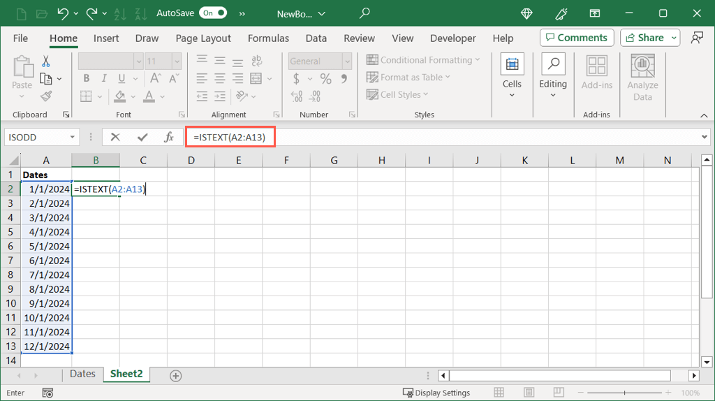 =ISTEXT(A2:A13)