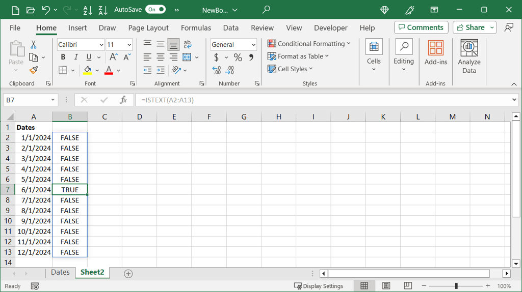 Like the other function, here we can see True for those dates formatted as text and False for the one that is not.