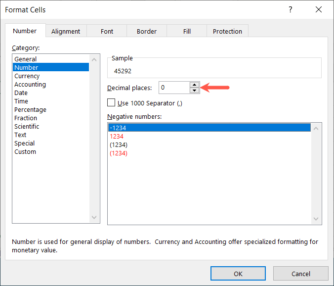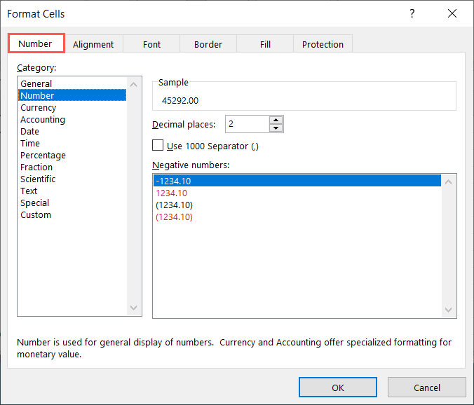 - In the Format Cells dialog box, go to the Number tab and choose Number on the left.