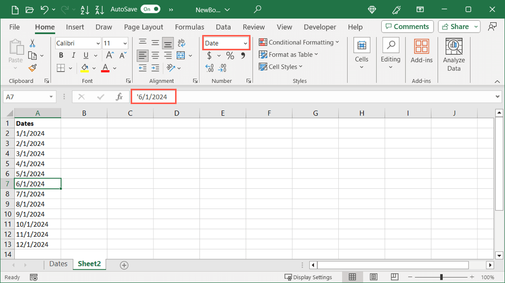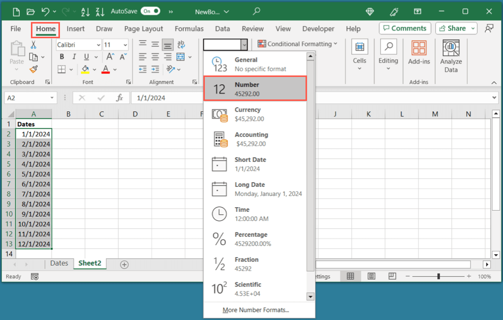 You can easily select the cell containing the date, head to the Home tab, and look at the Number Format drop-down box to see the current format of the cell. As you can see here, our date is formatted as a Date (number).