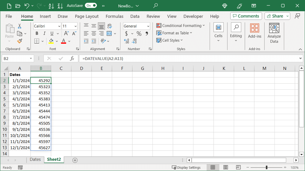 In this example, we’ll convert the cell range A2 through A13 from text dates to numbers with this formula: