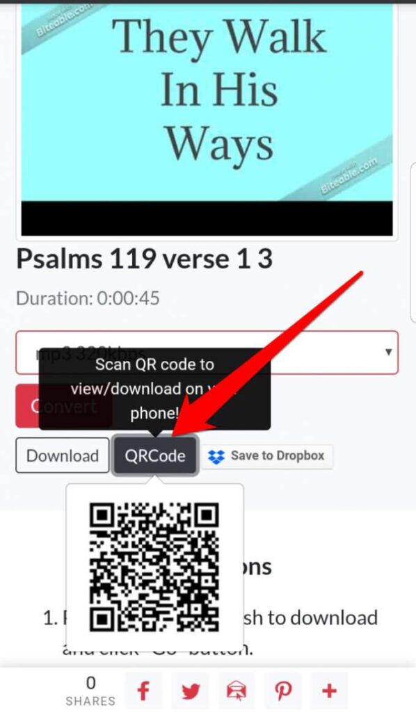 - Once the video is converted, you’ll get the option to **Download**, **scan a QR code** to download the audio file to your device, or **save it to Dropbox**.