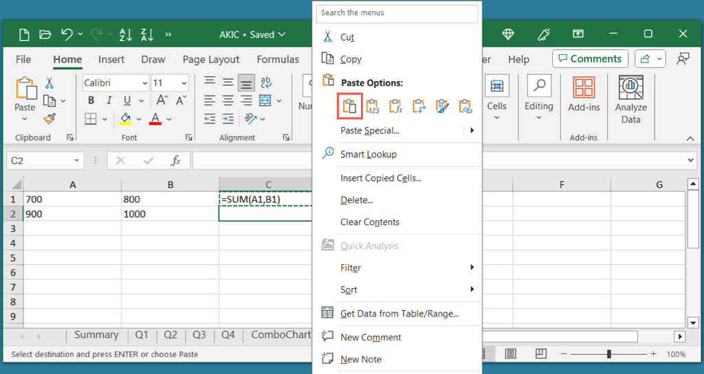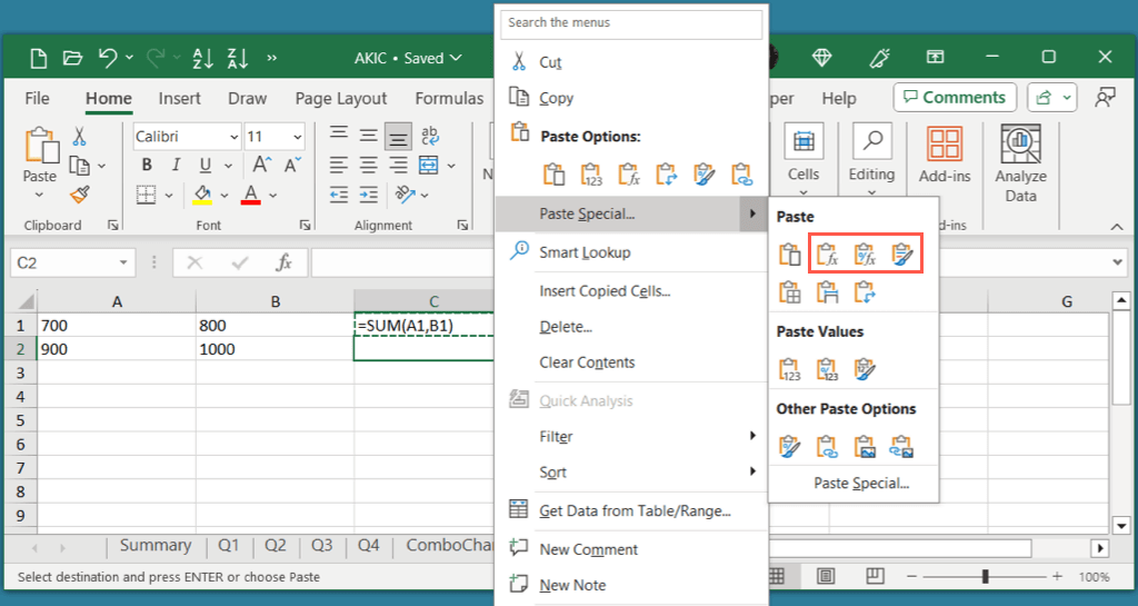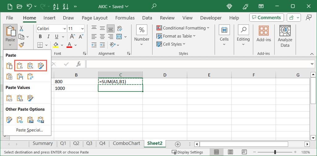 Keyboard shortcuts aren’t the only methods for copying and pasting formulas in Excel. You can use the built-in tools on the ribbon which include a Paste Special option if you want to include formatting in the operation.