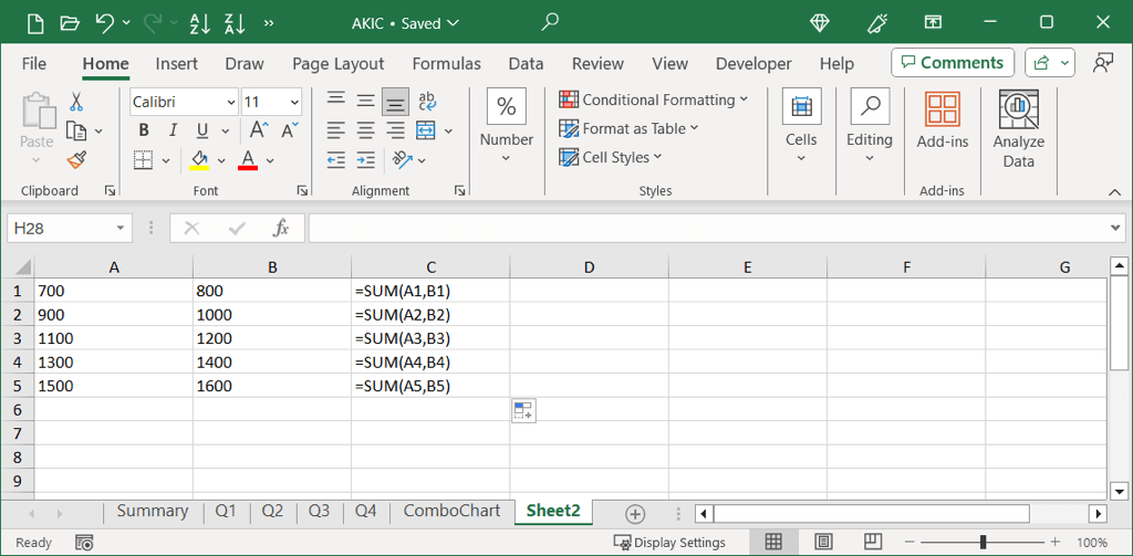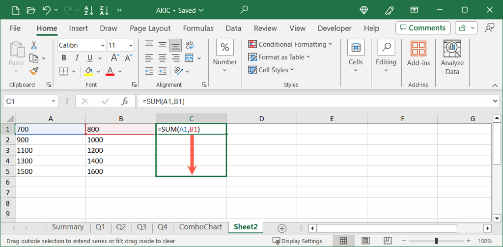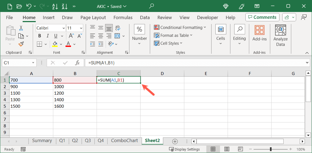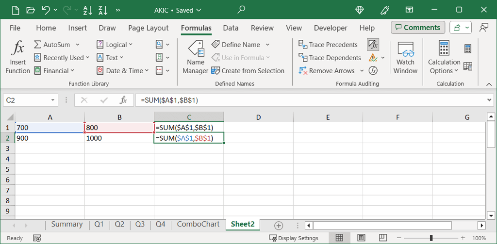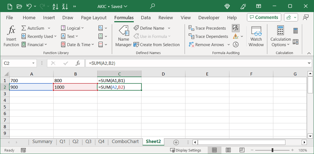Here, we have a formula in cell C1 to add the values in cells A1 and B1. We want to copy this formula to cell C2 and add the values in cells A2 and B2.