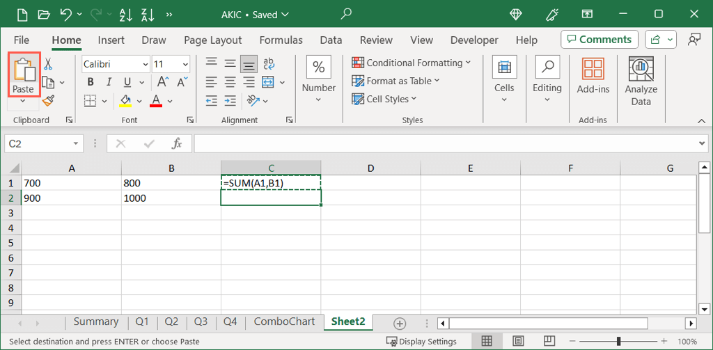 - Go to the cell(s) where you want the copied formula. * On the Home tab, use the Paste button to paste the formula and associated formatting.
