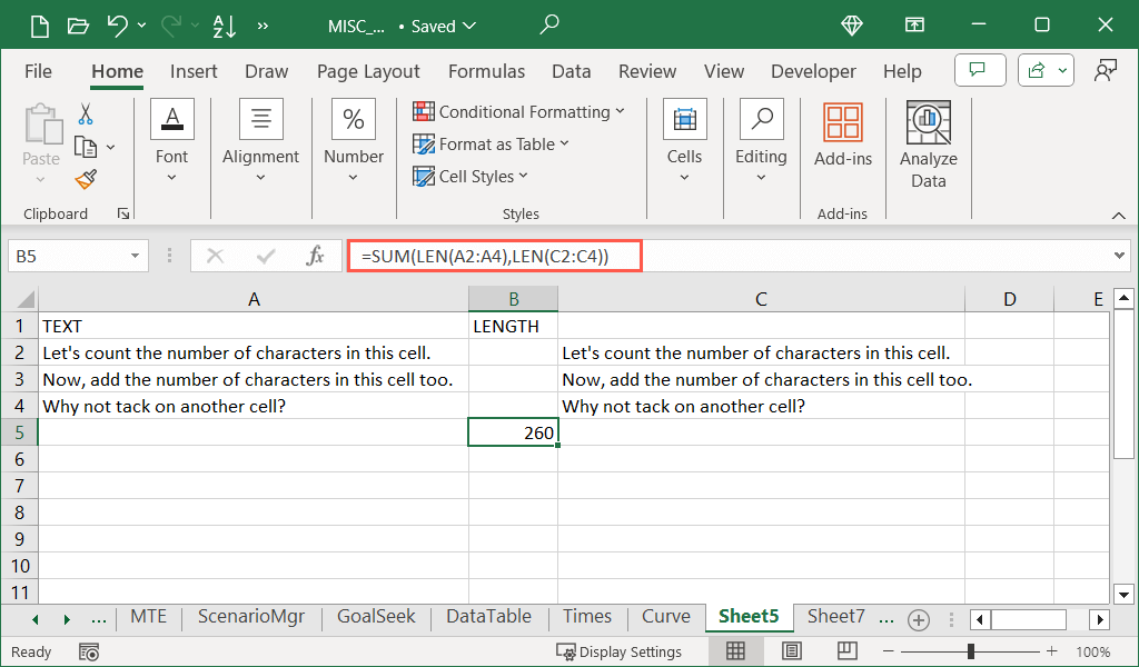 If you want to get the total number of characters in multiple adjacent cells, you can easily list out each cell reference using the formula above, but there’s a better way. You’ll still use the LEN and SUM functions to count characters in a range of cells.