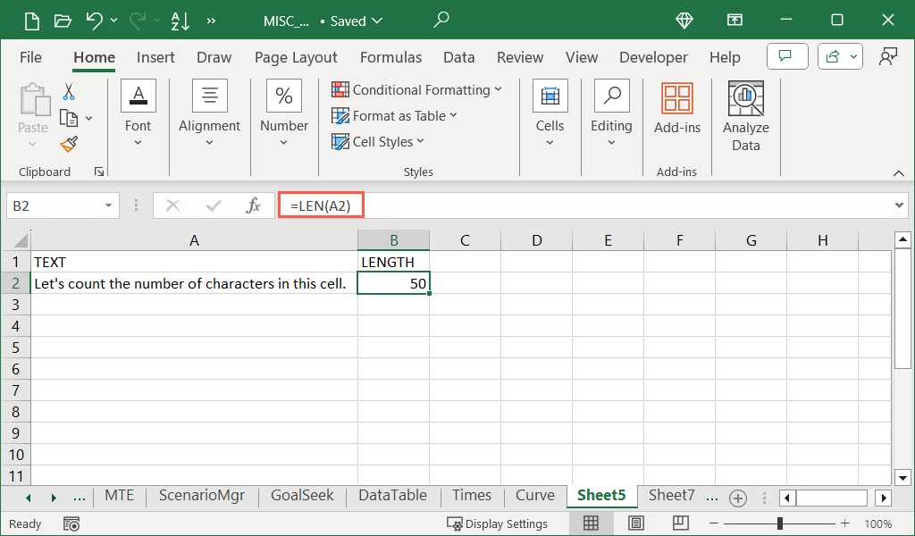 Tip: You can also count the number of bytes in a cell using the LENB function. For instance, use =LENB(A2) for the above example.