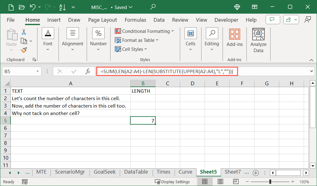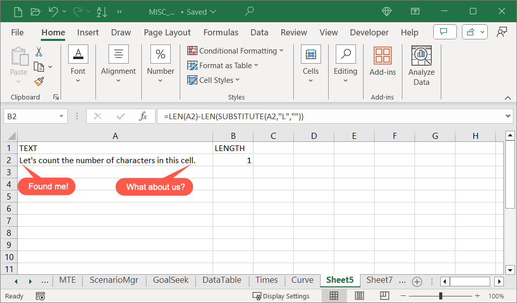 Maybe it’s the count of a specific character you need to find. For this, you’ll use LEN with the SUBSTITUTE function.