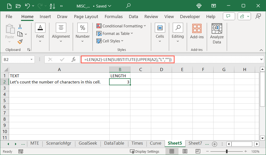 You can see our result of 1 is correct. Here’s a breakdown of the formula structure from the inside out: * SUBSTITUTE(A2,”L”,””) replaces all instances of the letter L with an empty string in cell A2.