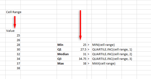 - First quartile: QUARTILE.INC(cell range,1)