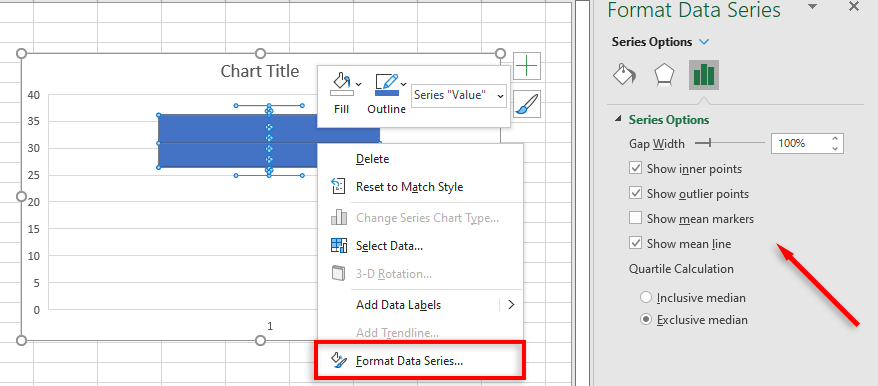 To add further display elements, right-click the box and whisker plot and select Format Data Series from the drop-down menu.