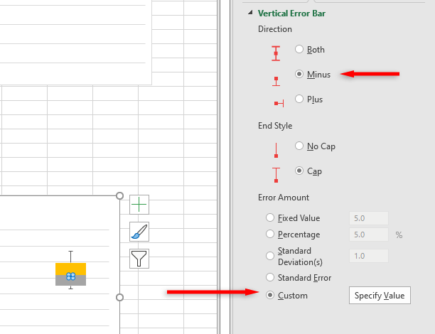 - Under Direction, click Minus and under Error Amount click Custom > Specify Value.