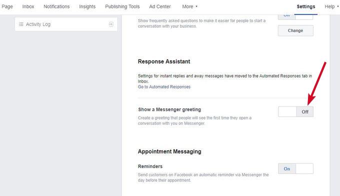 - In your Facebook page, click Settings>Messaging and set Show a messenger greeting to ON.