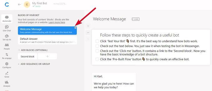 - Go to your Chatfuel dashboard, and click Welcome Message. Type your desired message – the changes will be saved automatically.