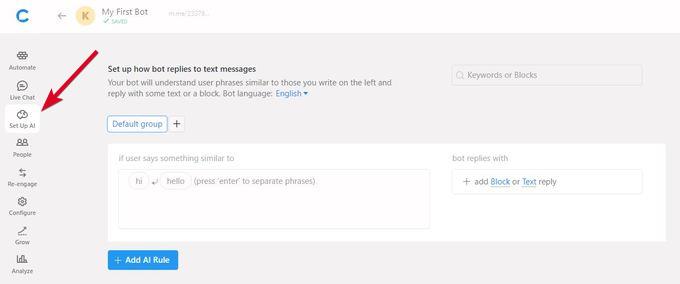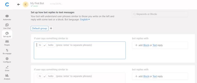 - Do this for as many keywords as possible. You can check with your customer support team for ideas on which keywords to use to set up your AI. Test the responses as you add them.