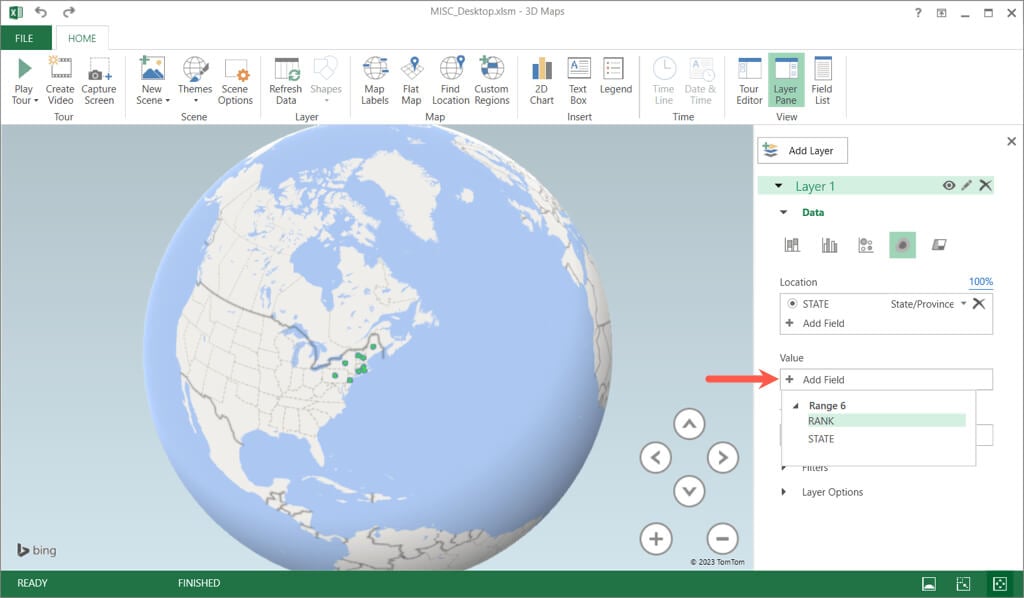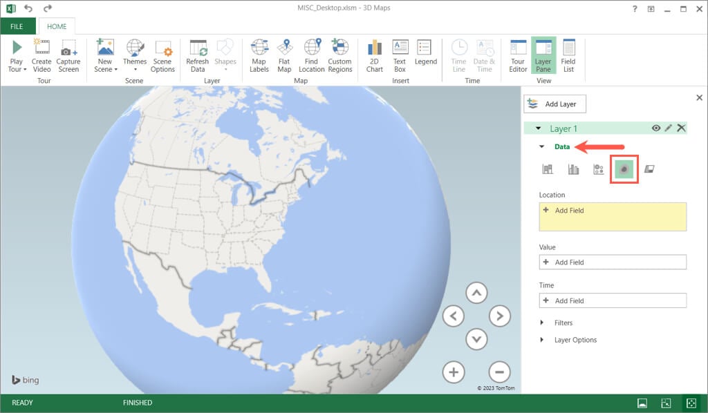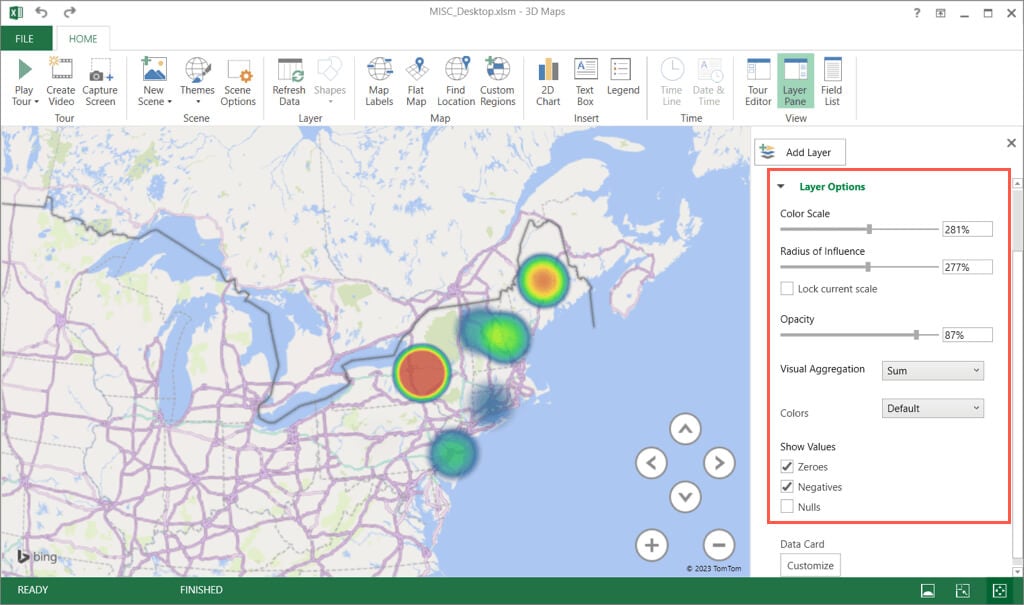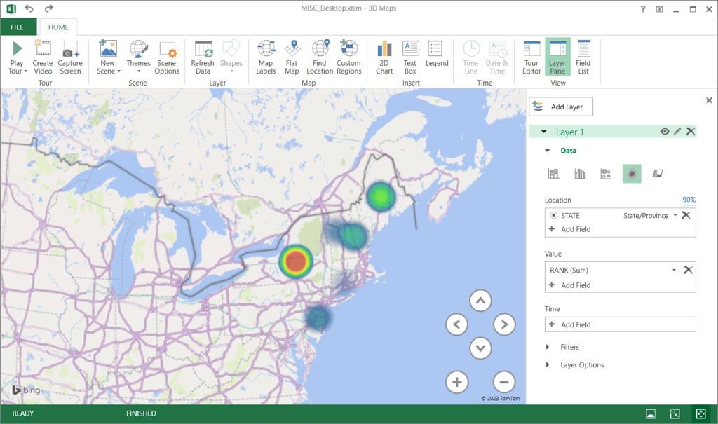 Another way to add a geographical heat map but with advanced options is using Microsoft Excel’s 3D Maps feature. With this, you have a 3D world map that you can spin and zoom. This option is useful if you want several layers or filtered data.