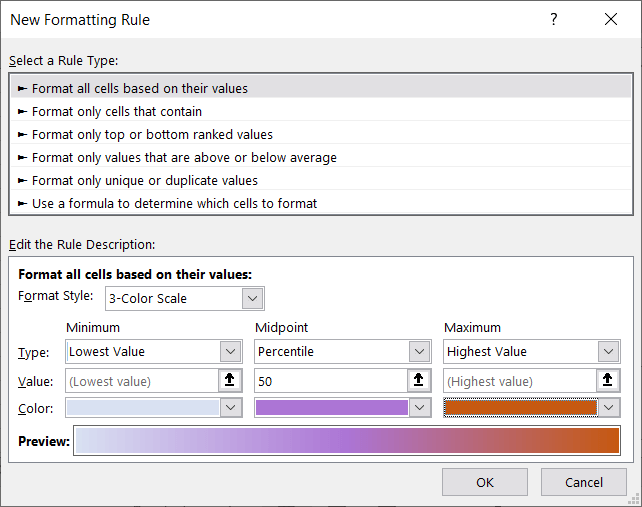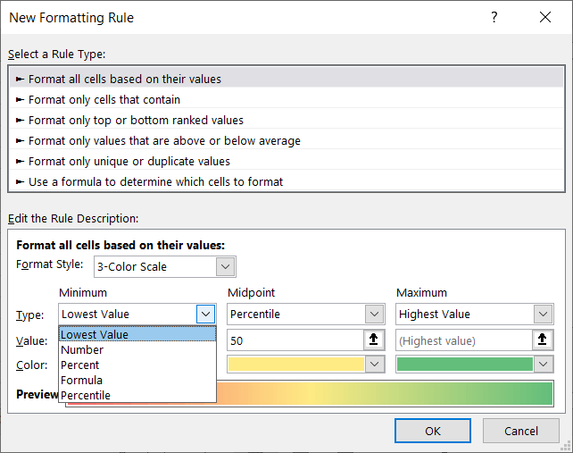 - Then, complete the details beneath: * Type: Choose the value types for the Minimum and Maximum as well as Midpoint if you use the 3-Color Scale. * Value: Choose or enter the corresponding value for the Type you pick above it. For instance, if you select Percentile in the Type section, enter the percent in the Value section. * Color: Choose the color for each Type or pick More Colors to select a custom shade.