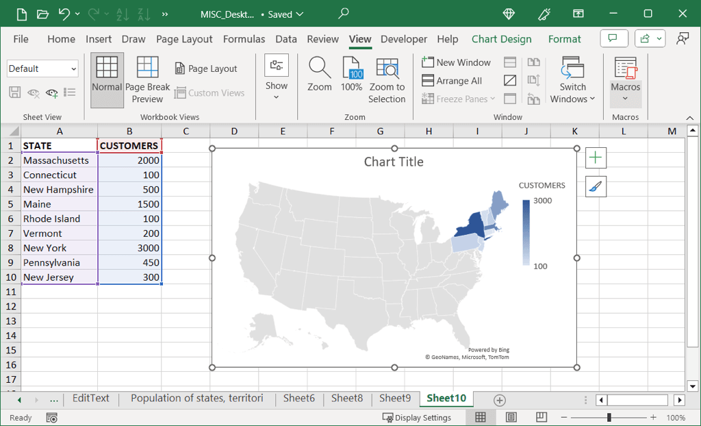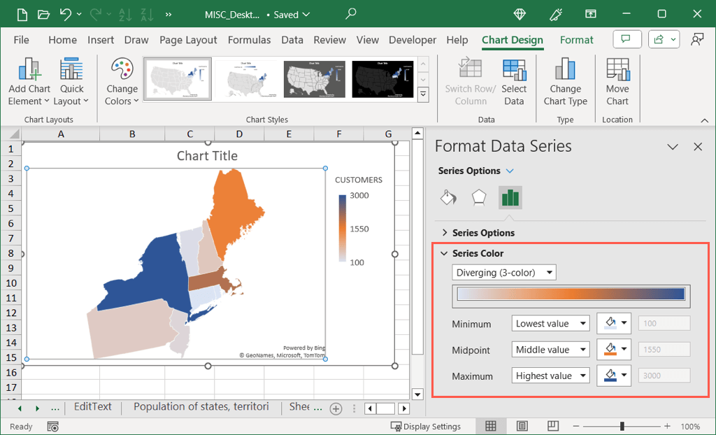 - Depending on the data you display and where your regions are located, you can adjust the map area, color scale, legend, and more. For general options, select the chart and use the Chart Design tab that displays. Here, you can add, remove, and edit the chart elements, adjust the layout, change the color scheme, and pick a different style.