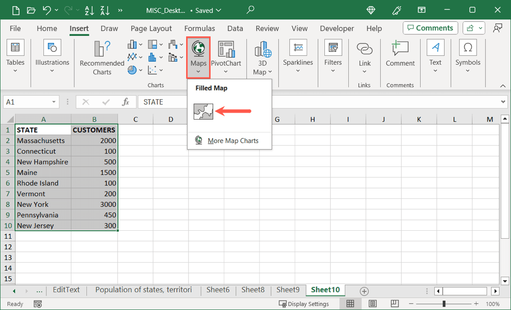 - Go to the Insert tab, open the Maps menu in the Charts section, and pick Filled Map.