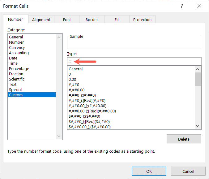 - In the Format Cells box, choose Custom on the left. Then, below Type on the right, enter ;;; (three semicolons) and select OK.