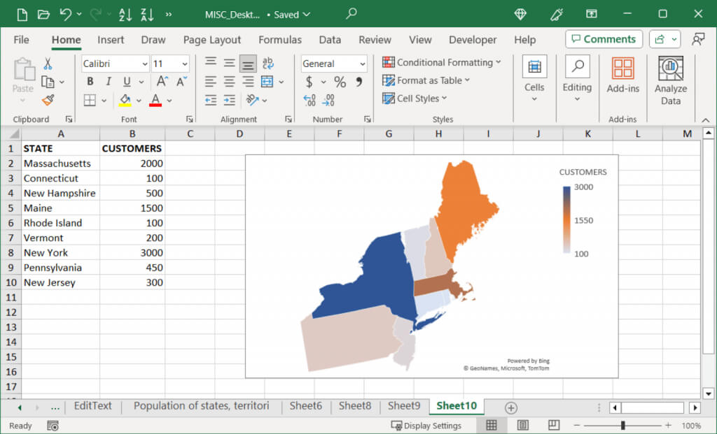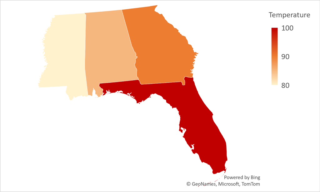 If your data relates to locations like states, regions, or countries, you can take your heat map up a level and use a geographical map chart. This still displays your values as color-coded indicators but plots them on a map with the matching locations.