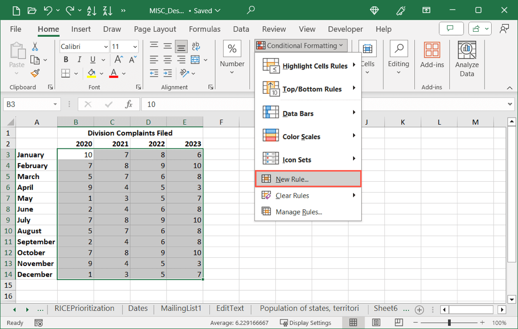 - Select the data you want to include, go to the Home tab, open the Conditional Formatting drop-down menu, and pick New Rule.