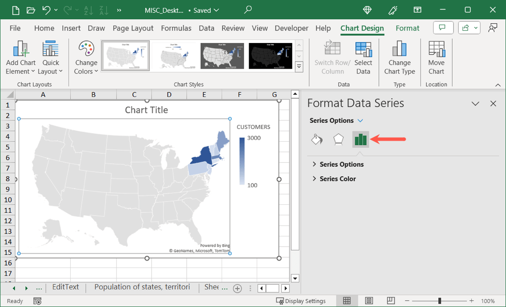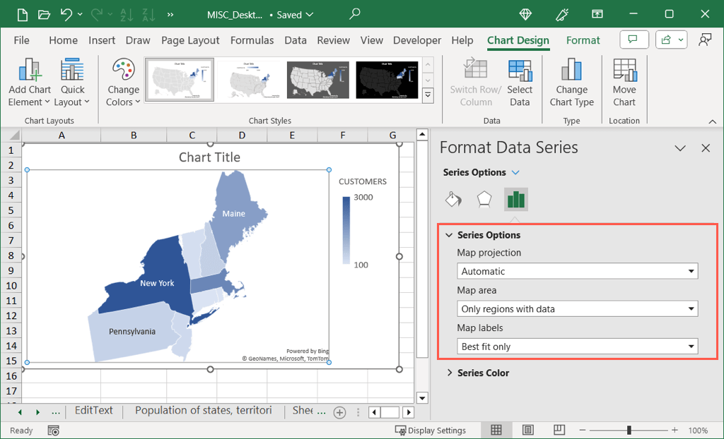 - Series Options: Use the Map Area drop-down menu to show only the regions containing data. This is helpful if you’re displaying only a few states in the U.S., for example. You can also use the Map Labels menu to add those labels.
