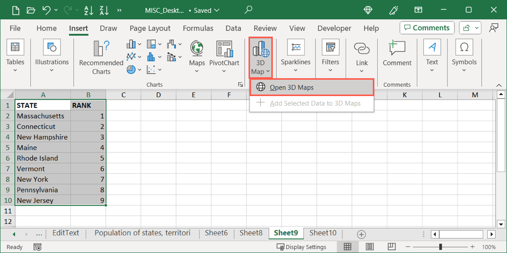 - Select the data for your map including the location names and optionally the column and row headers. Go to the Insert tab, choose 3D Maps in the Tours section, and pick Open 3D Maps.