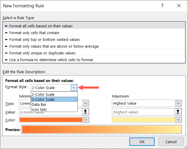 - In the bottom section, use the Format Style drop-down box to pick either the 2-Color Scale or 3-Color Scale.