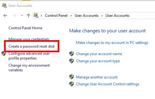 You’ll be shown a number of options for securing your Windows account. This includes the ability to create a password reset disk located in the left-hand pane.