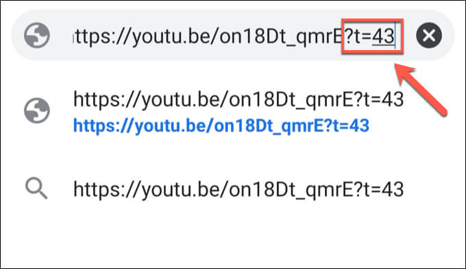 - With the video URL in your mobile device’s clipboard, paste the URL in a new location to allow you to edit it (for example, in your device’s note taking app or web browser). Using the steps in the sections above, add the timestamp to the URL (e.g., **https://youtu.be/on18Dt_qmrE?t=43**).