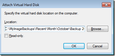 So if you just need to copy some files over from your backup, it’s makes much more sense to just attach the VHD file to your PC rather than restoring the backup, which will wipe your machine clean first.