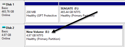 Once it has finished mounting, you will see it display as another Basic disk that is colored a light blue. Windows should automatically give it a drive letter, but if not, you can right-click on the part at the bottom where it says Healthy (Primary Partition) and choose Change Drive Letter and Paths.