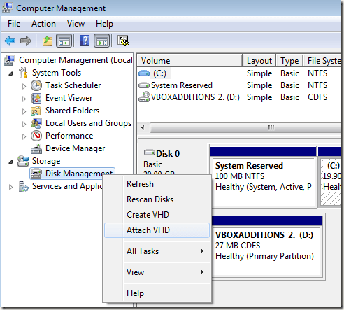 Now click on Disk Management in the left hand menu and wait for the list of drives and partitions to show up. Next, right-click on Disk Management and choose Attach VHD.