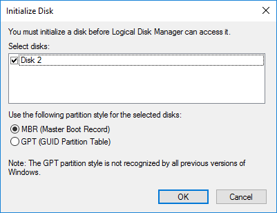 Next, you’ll have to pick whether you want to use MBR or GPT. For a full explanation of each partition format, check out this post by HTG. For compatibility with versions of Windows older than Vista, choose MBR. For newer features and bigger hard disks, use GPT.