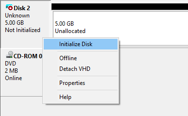 Now in Disk Management, you will see another disk (Disk 2 in my case) that says Not Initialized and Unallocated. In the grey section for the new virtual disk, right-click and choose Initialize Disk.
