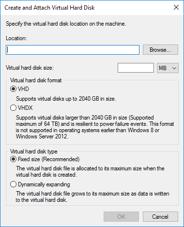 Instead of choosing Attach VHD, click on** Create VHD**. This will bring up a window where you can specify the size of the VHD file, the format and the location.