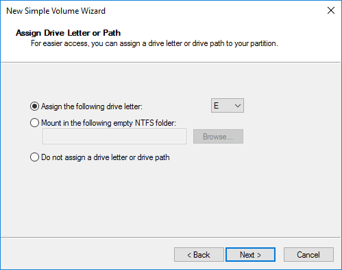 Click Next and choose a drive letter to assign to the partition.