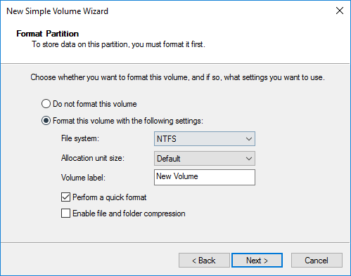 Lastly, choose how you want to format the drive. By default, it is set to NTFS, but you can also choose FAT32 if you like. I recommend sticking with NTFS if you are using the virtual hard drive to backup files from your computer.