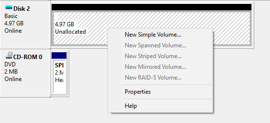 Now right-click in the white area that says Unallocated and choose New Simple Volume. This will bring up the new volume wizard. First, you have to choose the size of the new volume. It doesn’t have to be the full size of the unallocated space. You can create multiple partitions if your VHD is larger.