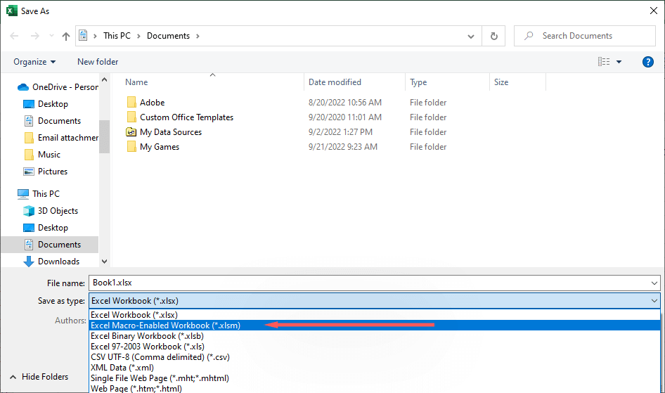- In the Save as Type drop-down menu, select Excel Macro-Enabled Workbook.