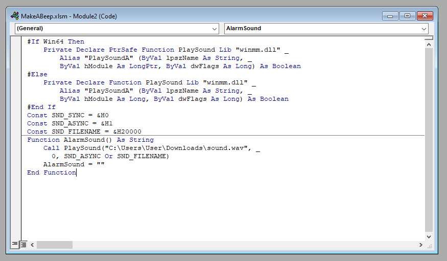 Call PlaySound(“C:UsersUserDownloadssound.wav”, _