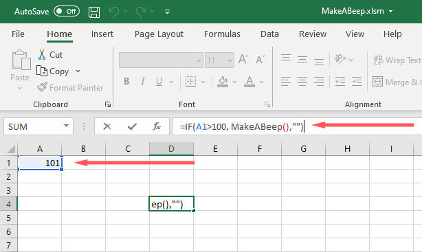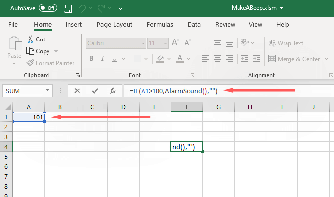 - Type “=IF(A1>100, MakeABeep(),””)” and press Enter.