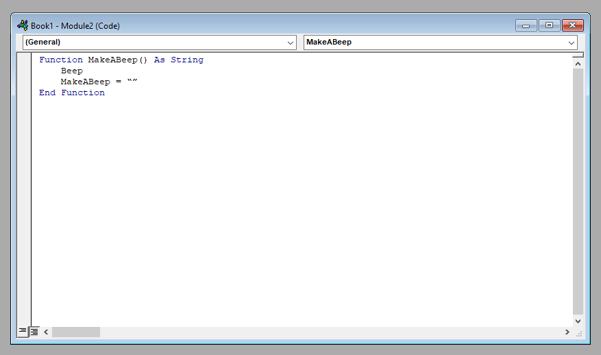 - In any cell, type “=MakeABeep()” and press Enter. If you hear a system sound, your code has worked, and it’s time to move on to the next step.
