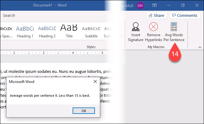MsgBox “Average words per sentence” + Str(Int(numWords/numSentences)) + “. Less than 15 is best.”