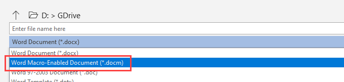Word defaults to save with the file extension .docx, which doesn’t allow macros to automatically run. If you want the macro to run, you’ll need to change the file type to Word Macro-Enabled Document (*.docm).