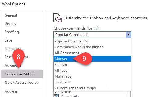 - Here you’ll assign the macro a button on the Word Ribbon. Select **Customize Ribbon**. * In the **Choose commands from:** dropdown, select **Macros**. This will show us our macros in the area beneath it.