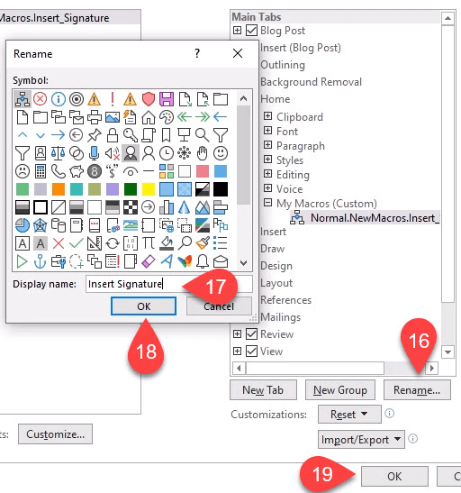 - You need somewhere on the ribbon to put the macro. For this example, select **Home **in the Main Tabs area.Then select **New Group**. * Select **Rename** so you can give it a meaningful name. * In the **Rename** window, select one of the icons to represent the group then enter **My Macros **in the **Display name **field. * Select **OK** to apply it. You’ll see the change in the **Main Tabs **area.