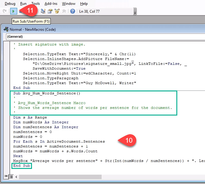 For most macros, the recording method is the most efficient way to create them. Eventually, you’ll want to do something more complex. This requires writing the macro in the Visual Basic for Applications (VBA) language. We’ve got the best VBA guide for beginners, so bookmark that. Let’s create a macro to give us the average words per sentence to help us tell when we’re being wordy.