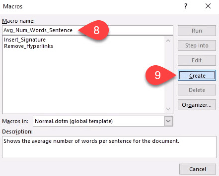 - Enter a meaningful name in **Macro name:** Leave the **Macros in: **as Normal.dotm so it will apply to all Word documents. Always enter a description in the **Description: **area. * Select **Create**. The **Microsoft Visual Basic for Applications **development tool will open.